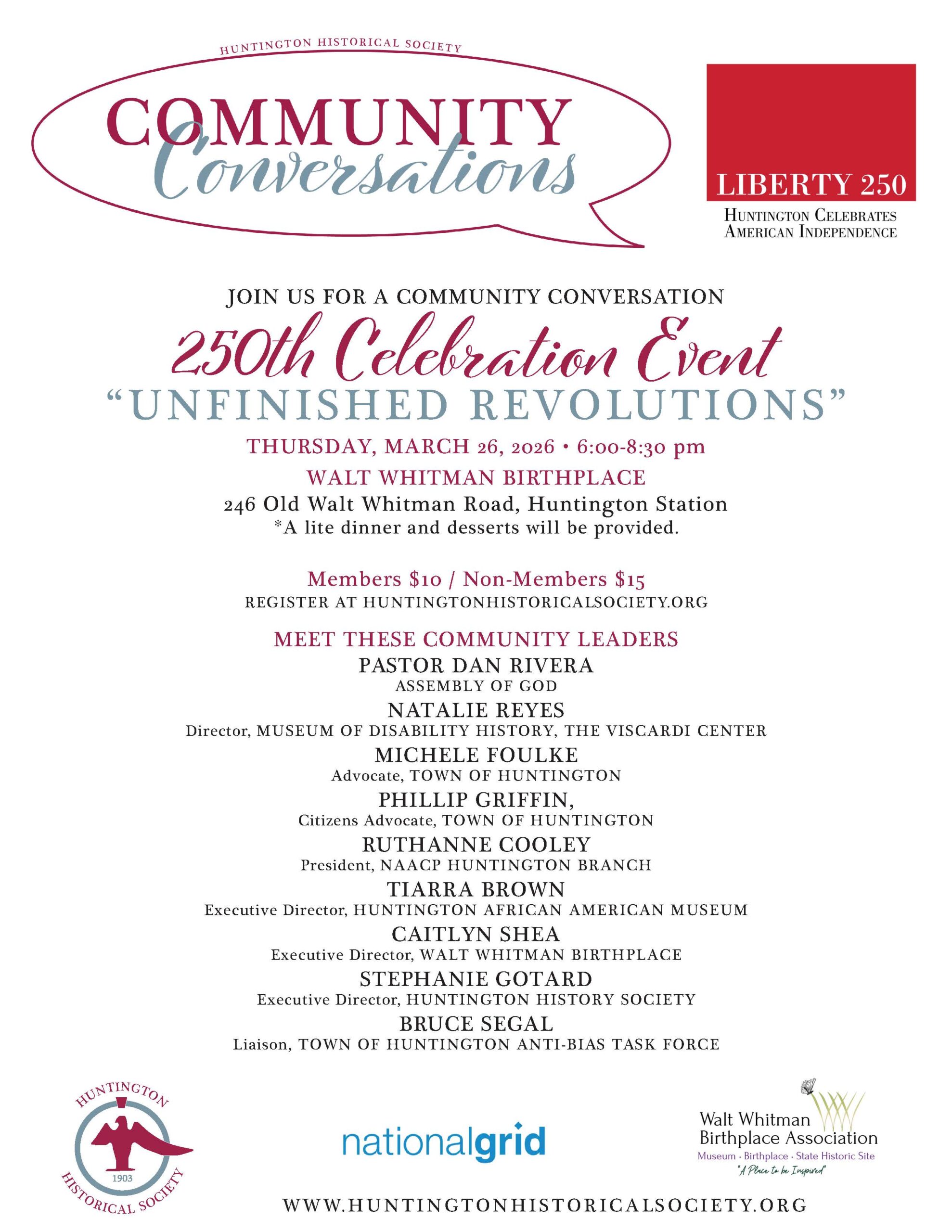 The Huntington Historical Society is holding a Walt Whitman Birthplace Collaborative event “Unfinished Revolutions” on Thursday, March 26th 6:00-8:00 pm at Walt Whitman Birthplace.